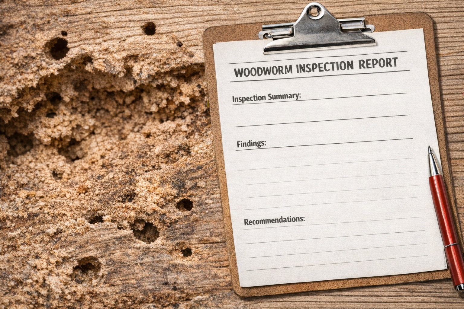 Signs of woodworm include tiny, round exit holes, fine powdery bore dust (frass), weak/crumbly wood and visible tunnels inside timber, with active infestations often marked by fresh holes, new dust, or live beetles especially around May-Oct.